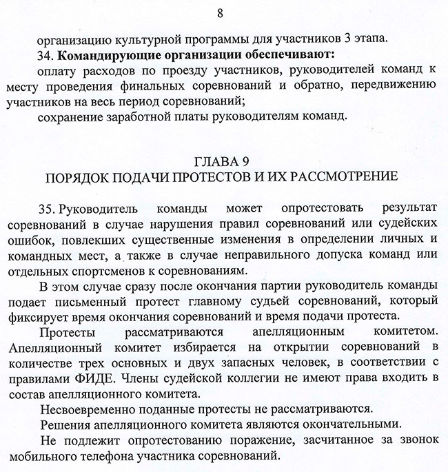 30 апреля: завтрак с 8.30 до 9.15 ; 6 тур с 9.30 до 11.45; 7 тур с 12.00 до 14.15; закрытие соревнований в 14.30; обед с 15.00 до 16.00;