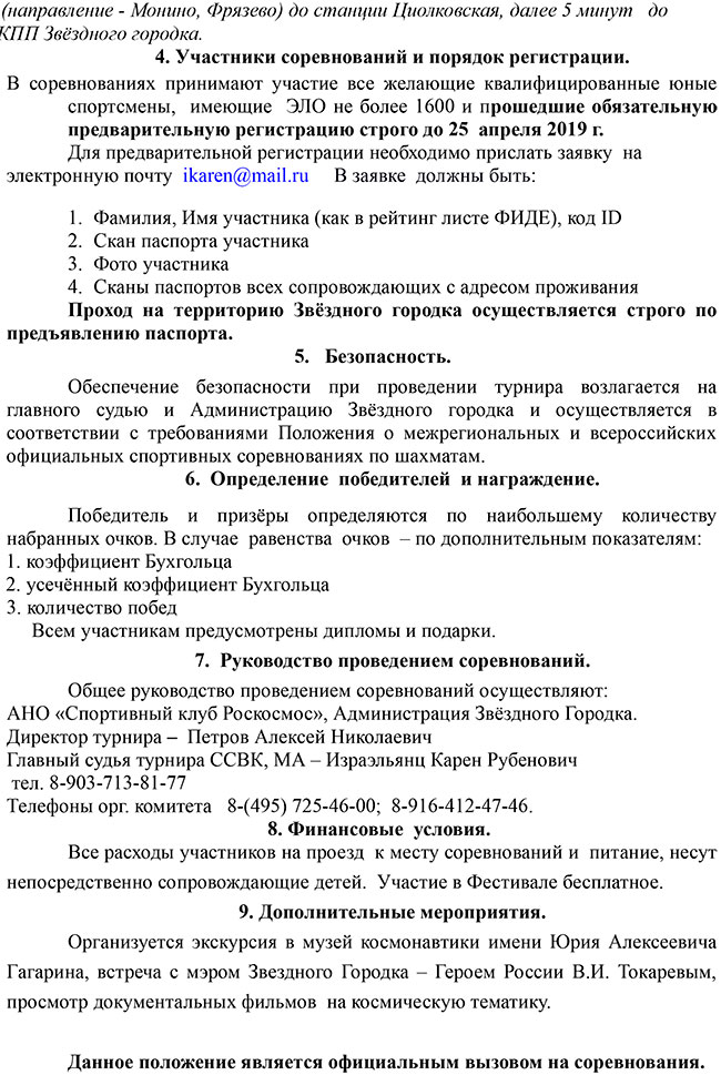 Спортивный клуб Роскосмоса и Администрация Звёздного Городка приглашают юных шахматистов 2006 г.р. и младше принять участие в 4-м международном детском фестивале по быстрым шахматам «Юные Звёзды», имени Героя России, лётчика – космонавта В.И. Токарева, посвящённого 58-й годовщине первого полёта человека в космос.