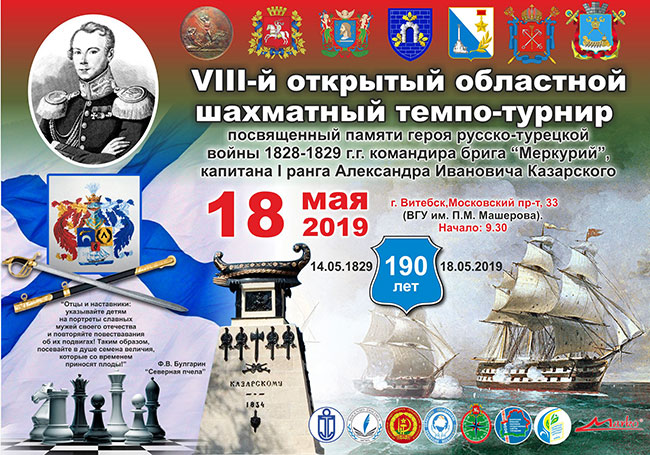 Турнир памяти знаменитого моряка родом из сухопутной Беларуси прошел в г. Витебске в восьмой раз. В текущем году датой проведения он чуть-чуть предшествовал 190 - летнему юбилею знаменитого во всем мире подвига российского брига "Меркурий" и его легендарного командира, нашего земляка, уроженца местечка Дубровно капитан-лейтенанта Александра Ивановича Казарского. Бой 14 мая 1829 года (по новому стилю -26-го мая) вошел в анналы тех сражений, которые никому не удалось повторить! Бриг с 18 корронадами для ближнего боя на вооружении, встретившись с османской эскадрой в составе 16 судов вступил в беспримерное до сих пор во всей мировой истории сражение против двух их трехпалубных линейных кораблей во главе с двумя их адмиралами. На виду всего флота, с 184 пушками на их борту, оба адмирала, отряженных кораблей для пленения непокорного судна увидели уже себя обласканными самим султаном. Настигнув бриг и непрерывно обстреливая его в ходе трехчасового боя, они пошли на абордаж, но допустили при этом оплошность, сблизившись с обреченным, как им показалось. Вскоре раздалась и повелительная команда: "Сдавайся, опускай паруса!"
