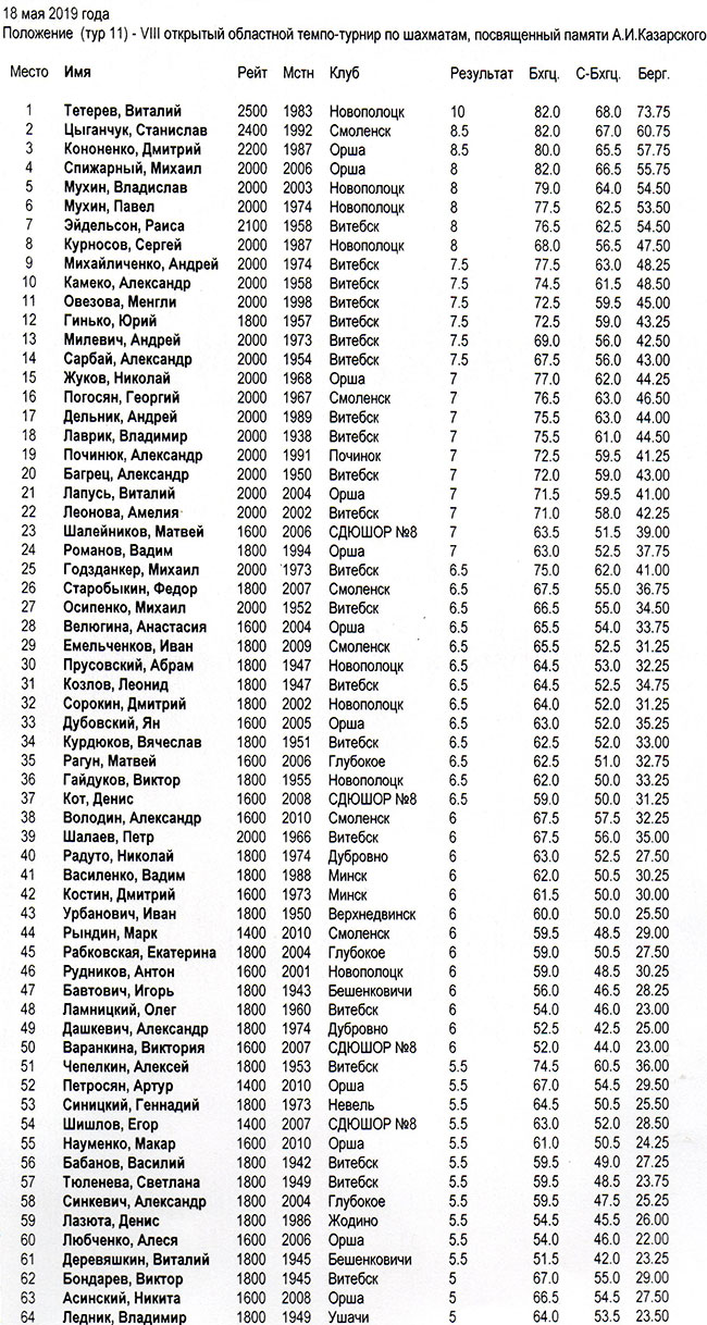 Занявший второе место Станислав Цыганчук из Смоленска набрал 8.5 очка, а третьим стал с таким же очковым приобретением Дмитрий Кононенко из Орши.