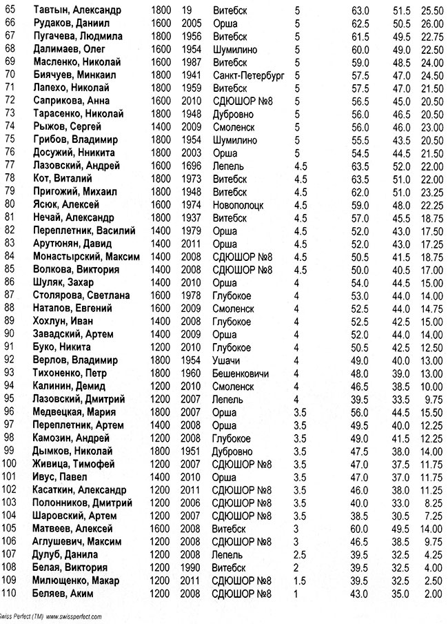 Что касаемо до самого турнира.... В турнире приняли участие 110 шахматистов, из них 2 международных гроссмейстера: Виталий Тетерев и Раиса Эйдельсон, а также 22 других шахматиста с рейтингом 2000 и выше (м/мастера, мастера и кмс) из 17 городов Республики Беларусь и Российской Федерации. Виталий - победитель Всемирной шахматной Олимпиады и призер многих международных турниров, Раиса - бронзовый призер первенства СССР, многократная чемпионка Беларуси, призер многих международных турниров. Расширился и состав участников турнира. кроме традиционных, из: г.г. Смоленска, Великих Лук, Рудни, Минска, Жодино, городов и районов Витебской области, впервые в нем приняли участие шахматисты из др. городов: Лепель, Санкт-Петербург, Починок Смоленской и Невель Псковской области Российской Федерации.