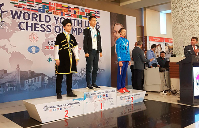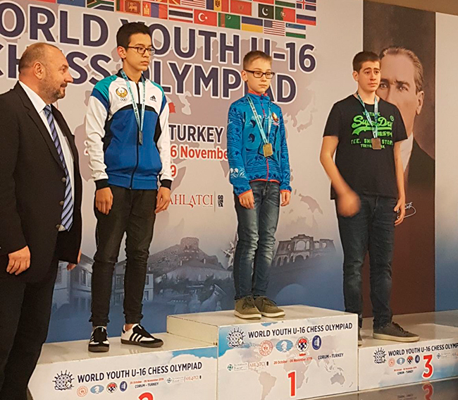 Денис Лазавик, Максим Царук, Иван Рунец, Артем Синявский и Александра Тарасенко (тренеры команды Мерибанов, Ерошенко) в составе сборной Беларуси заняли 3 место на Всемирной юношеской шахматной Олимпиаде в Турции.