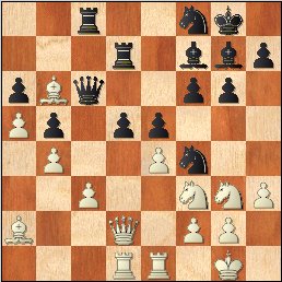Черные уже приготовились принимать сдачу соперника — висит мат и на всякий случай еще и белый слон под боем. Но тут последовало ошеломляющее 32.Bh7!! И вдруг как-то выяснилось, что мата нет, а все черные фигуры подвисли в воздухе. 32 Rf8? Еще позволяло держать удар скромное 32 Rh6 33.Ng4 R8:h7 — и вся борьба еще впереди. Сейчас же после 33.Qg3 позиция черных рассыпается. 1-0.