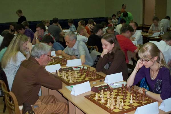 Еще не успела начаться фотосессия наших корреспондентов, а земляки из Санкт-Петербурга лидеры турнира игравшие за первой доской Александр Халифман и Даниил Линчевский уже "расписали" ничейку и ловко улизнули от фотовспышек. Остальные события тура в традиционном фотоотчете.