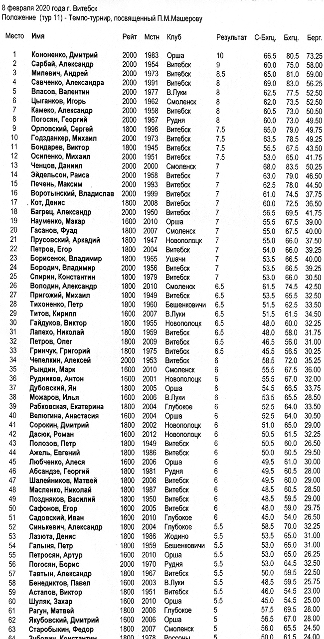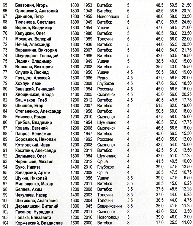 Вторым с 9 очками - ветеран, КМС Александр Сарбай, третьим с 8.5 – КМС Андрей Милевич (оба Витебск), еще пять шахматистов набрали по 8 очков. Четвертое место по лучшему коэффициенту заняла мастер Александра Савченко (Витебск), на последующих местах разместились: мастер Валентин Власов (Великие Луки), КМС Игорь Цыганков (Смоленск), КМС Александр Камеко (Витебск) и мастер Георгий Погосян (Рудня).