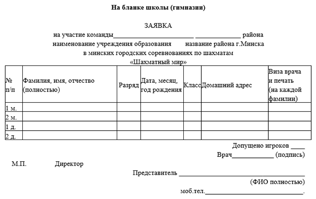 Копии заявки, заверенной таблицы предварительных отборочных соревнований подаются по электронной почте на адрес minskchess@outlook.com до 19 апреля 2020г.