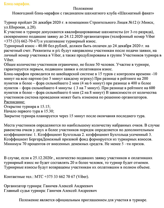 26 декабря шахматный клуб "Шахматный фанат" организовывает новогодний блиц-марафон. Турнир пройдет в помещении строительного лицея №12 по адресу г.Минск, ул.Широкая, д.28).