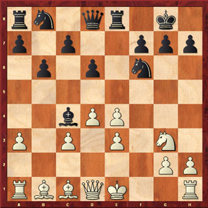 1.d4 Nf6 2.c4 e6 3.Nc3 Bb4 4.e3 0-0 5.a3 Bxc3+ 6.bxc3d6 7.Bd3 e5 8.Ne2 e4 9.Bb1 b6 10.Ng3 Re8 11.f3 Ba6 12.fxe4 Bxc4