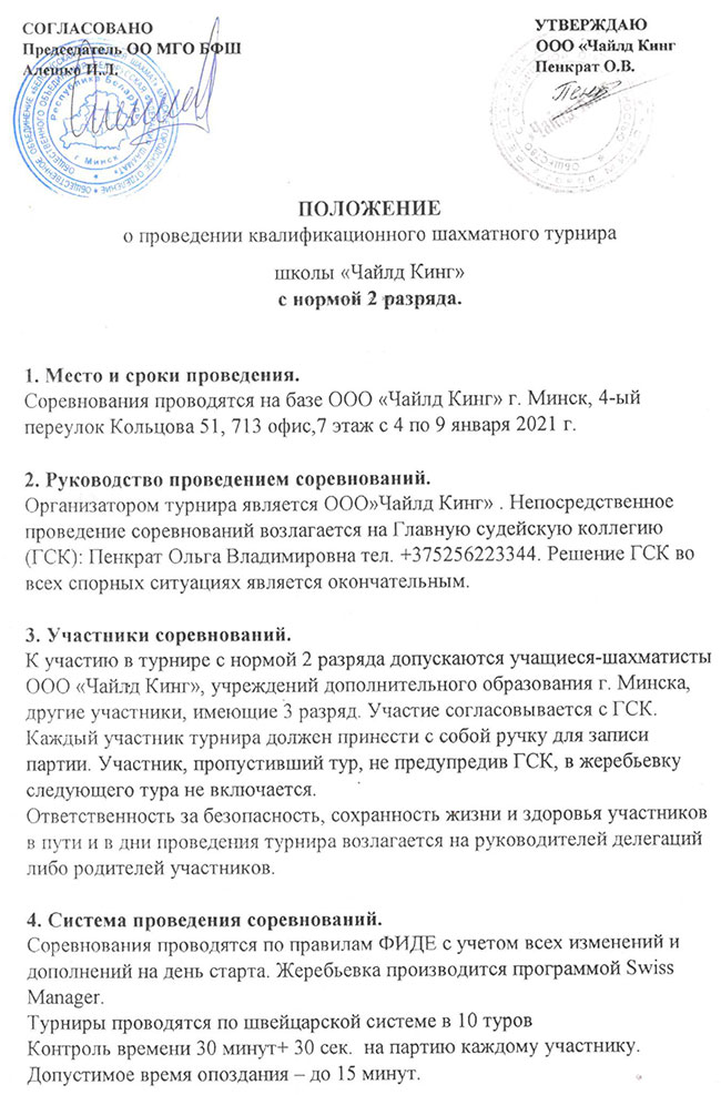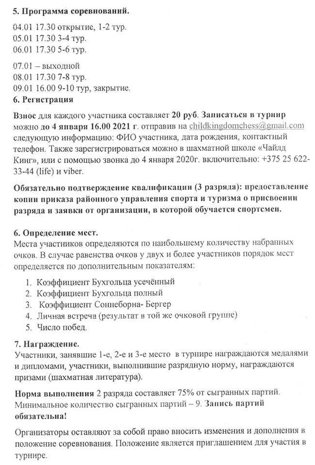 С 4 по 9 января на базе ООО "Чайлд Кинг" (г.Минск, 4-й пер.Кольцова, 51) пройдет шахматный турнир с нормой 2 разряда.