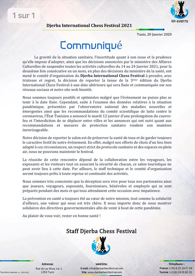 Если перевести только суть, то в связи с эпидемиологической обстановкой III международный шахматный фестиваль «DJERBA INTERNATIONAL CHESS FESTIVAL» будет перенесен на более поздний срок, который организаторы очень скоро назовут и разместят на своем официальном сайте.