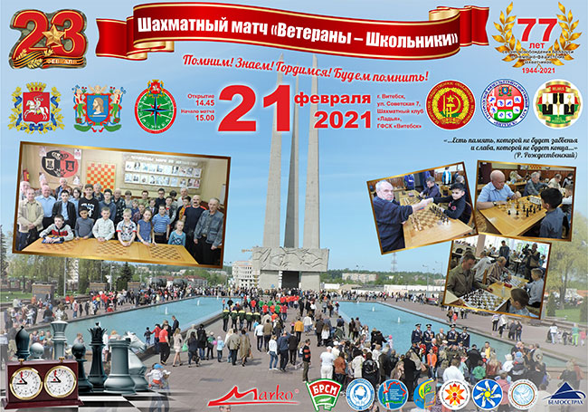 Витебский областной совет ветеранов БООВ совместно с партнерами организовал (21 02.21 г.) в шахматном клубе «Ладья» ГФСК «Витебск» проведение традиционного шахматного матча «Ветераны – Школьники», посвященного Дню защитников Отечества и Вооруженных Сил Республики Беларусь.