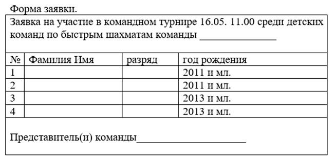 Состав команды 4 человека: 2 участника 2011 г.р. и младше (1,2 доска), 2 участника 2013 г.р. и младше (3,4 доска). Число мальчиков и девочек в команде может быть любым в т.ч. и 4+0 или 0+4. Расстановка участников по доскам проводится в порядке, указанном в заявке. Допускаются запасные участники в команде.