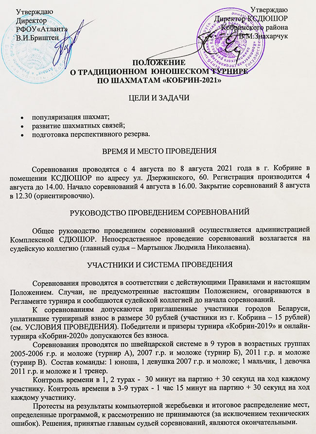 4 августа 2021 года в городе Кобрине стартовал традиционный юношеский турнир по шахматам «Кобрин-2021». Более 120 юных шахматистов из разных уголков Беларуси собрались в этом небольшом уютном городке, чтобы поучаствовать в соревнованиях.