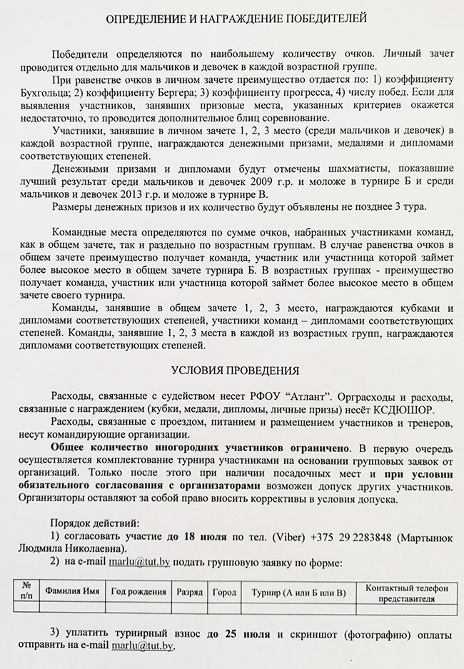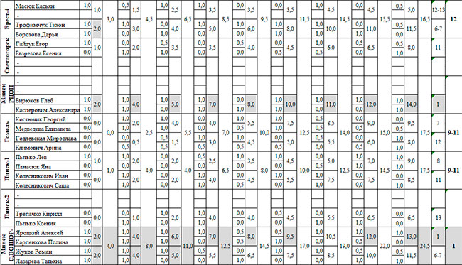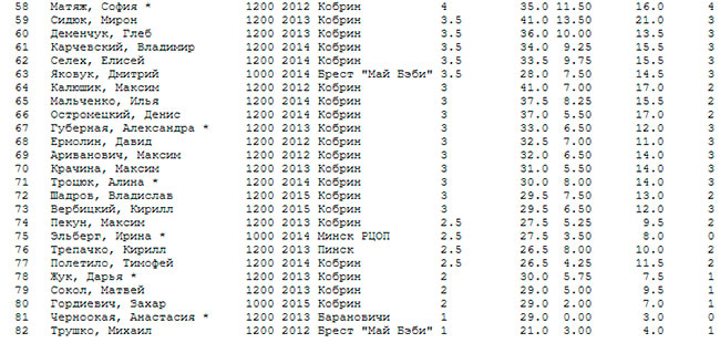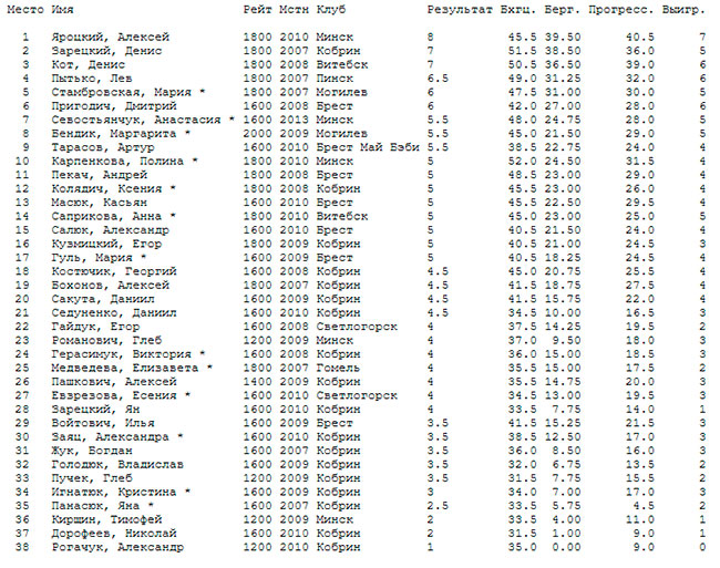 Место Имя Мстн Результат Бхгц. Берг. Прогресс. Выигр. 1 Шабан, Александра 2000 6 29.5 24.50 24.5 5 2 Чирун, Павел 2000 5.5 30.5 22.50 21.0 5 3 Кузмицкий, Иван 1800 5 32.0 21.50 24.0 5 4 Пекач, Андрей 1800 4.5 32.5 19.00 20.5 4 5 Бендик, Маргарита 2000 4.5 32.0 18.75 17.5 4 6 Рабчёнок, Геннадий 2000 4.5 23.0 12.25 13.5 4 7 Стамбровская, Мария 1800 4 27.0 11.50 19.0 4 8 Кузич, Арина 2000 4 26.5 11.50 16.0 4 9 Мисюта, Сергей 2000 4 21.0 8.00 13.0 4 10 Прилуцкий, Михаил 1800 3.5 25.5 9.75 14.0 3 11 Кирчук, Александр 1800 3.5 24.5 9.75 14.0 2 12 Селях, Сергей 1800 3.5 23.5 6.75 15.5 3 13 Зарецкий, Денис 1800 3.5 21.0 8.75 11.5 3 14 Чехович, Дмитрий 1800 3 16.0 4.00 7.0 3 15 Грицук, Владислав 1800 2.5 23.5 6.75 12.0 2 16 Севостьянчук, Анастасия 1600 2.5 23.0 5.25 14.0 2 17 Саприкова, Анна 1800 2 21.0 2.00 4.0 2 18 Игнатюк, Евгений 1800 2 20.0 3.00 9.0 2 19 Кузмицкий, Егор 1800 2 19.0 2.00 10.0 2 20 Лапекина, Елизавета 1800 0 19.0 0.00 0.0 0