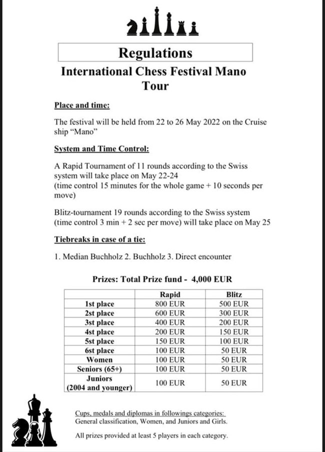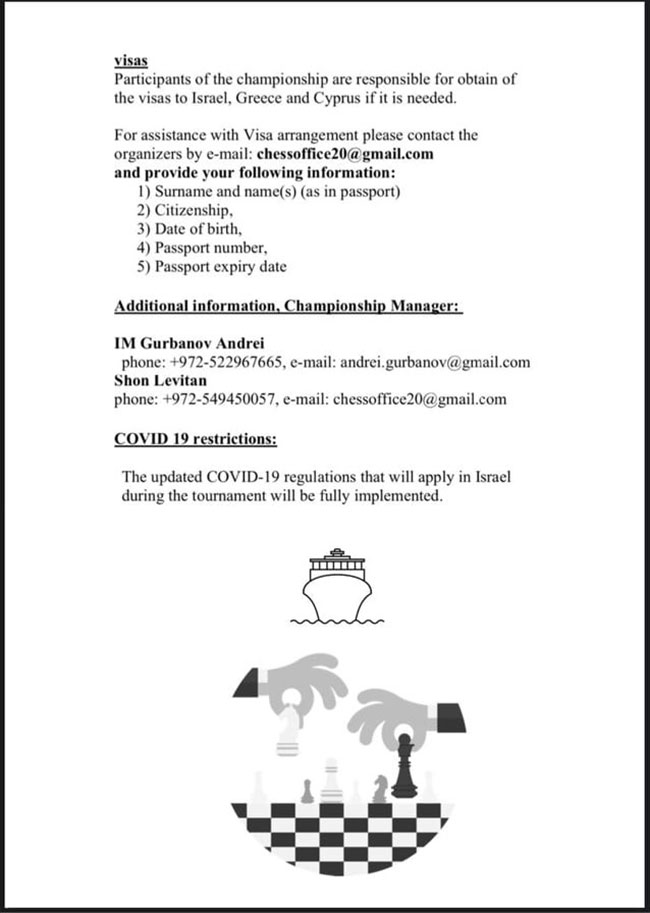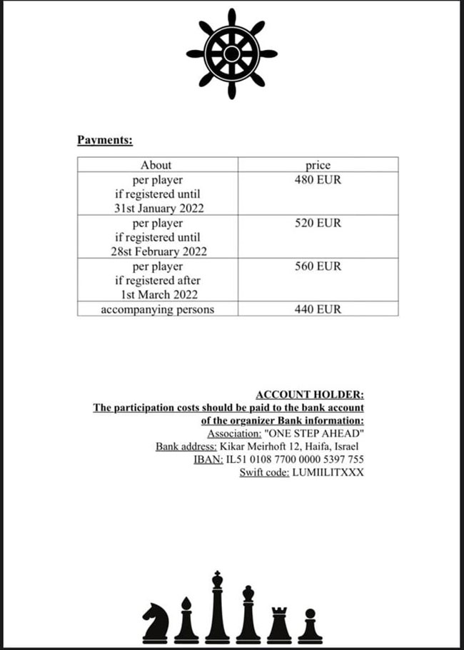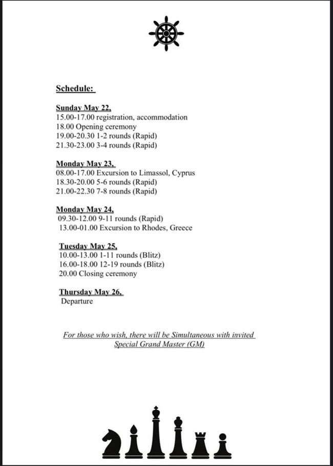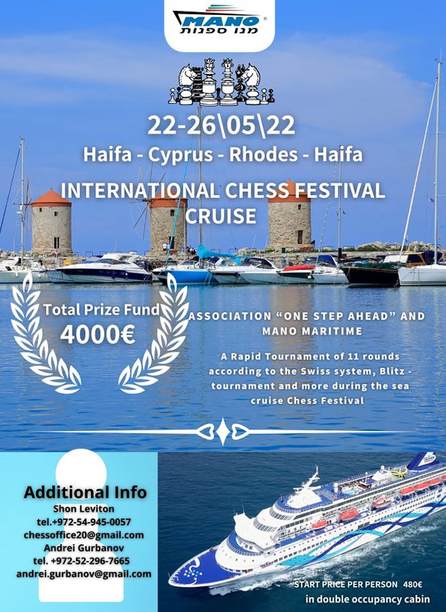 Белорусских любителей шахмат приглашают принять участие с 26 по 30 мая 2022 г в международном шахматном турнире с призовым фондом в 4000 евро (рапид, 11 туров), который пройдет на круизном лайнере по маршруту г.Хайфа – о.Кипр – о.Родос – г.Хайфа. В рамках круиза будет организована культурная программа с экскурсией на о.Кипр.