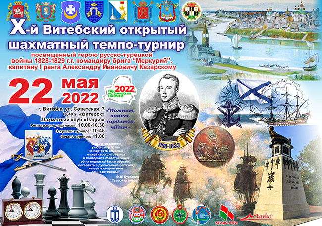 22 мая в день святого Николая Святителя и Чудотворца, покровителя моряков, состоялся X-й Витебский шахматный темпо-турнир, посвященный нашему этническому земляку родом из местечка Дубровно, Александру Ивановичу Казарскому, легендарному офицеру-моряку, герою русско-турецкой войны 1828 – 1829 гг., капитану 1 ранга командиру брига «Меркурий» российского флота. Он был приурочен к предстоящему 224 -летию со дня рождения Казарского, 193-ой годовщине легендарного подвига брига «Меркурий», 183-ой годовщине возведения нашему земляку первого памятника в Севастополе и первого памятника в России боевому офицеру-моряку. Его подготовили и организовали: Витебский областной совет Белорусского общественного объединения ветеранов, управление спорта и туризма Витебского облисполкома, УО «Витебская ордена «Знак Почета» государственная академия ветеринарной медицины», издательство «Гангут» (Санкт-Петербург) и первый заместитель Белорусской шахматной федерации Николай Зарубицкий, одновременно руководитель РОО «Патриоты Беларуси», а также ООО «Быстрые автомобильные мойки», выступивший спонсором.