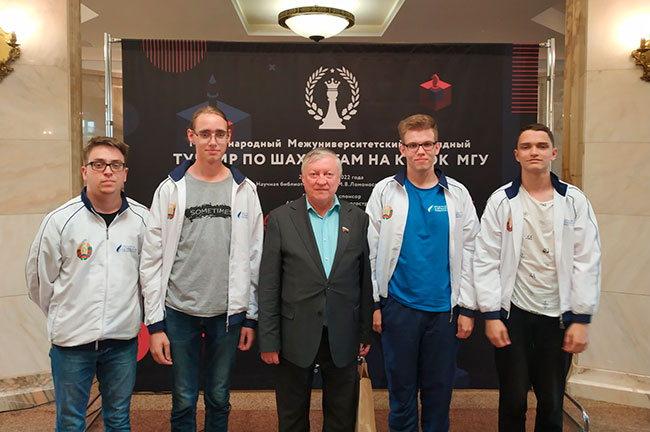 С 19 по 24 июня 2022 года в Москве пройдет международный университетский командный турнир на кубок Московского государственного университета им. М.В.Ломоносова. Белорусская федерация шахмат совместно с ректоратом БГУ и "Ассоциацией шахматных федераций" организовали участие команды Беларуси в данном соревновании. Нашу страну будет представлять команда Белорусского государственного университета в составе Ярамира Болко (3 курс, 1 разряд), Алексея Крамича (3 курс, кмс), Александра Рапопорта (4 курс, кмс) и Артема Синявского (учащийся 10 класса СШ №6 г.Минска, FM). Напомним, в составе команды могут быть студенты, аспиранты, преподаватели, доценты, профессора и другие сотрудники университета. Допускается участие в команде 1 шахматиста не являющегося студентом, аспирантом, преподавателем, доцентом, профессором и другим сотрудником одного университета. Турнир проводится по круговой системе в 9 туров.