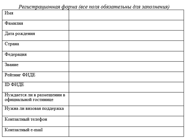 Неполные регистрационные формы не принимаются. Все игроки или официальные лица должны иметь ID FIDE. В случае отсутствия такового, нужно обращаться за получением в свою национальную федерацию шахмат.