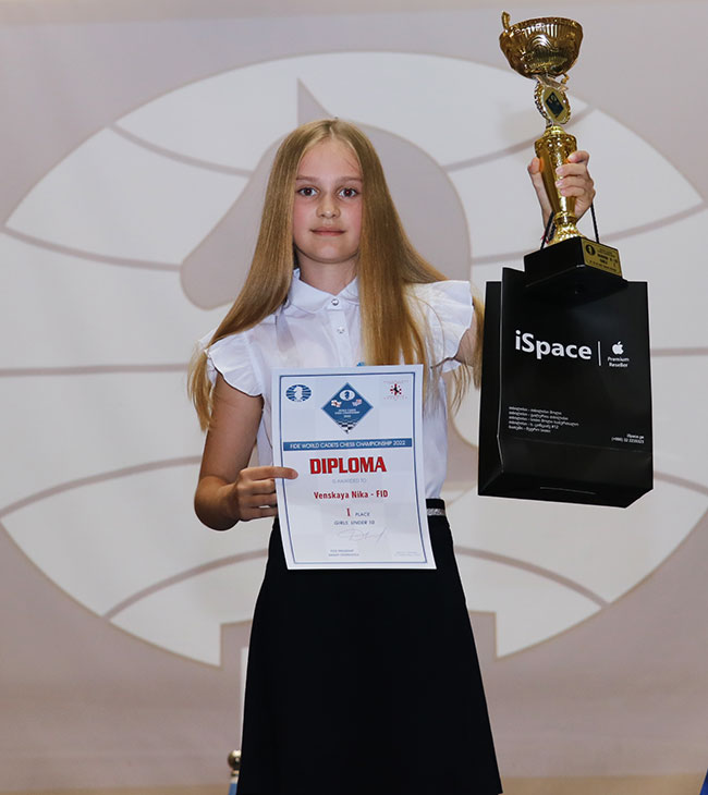 Ника Венская, набрав 9,5 очков из 11 стала чемпионкой мира в возрасте до 10 лет среди девочек. Поздравляем!