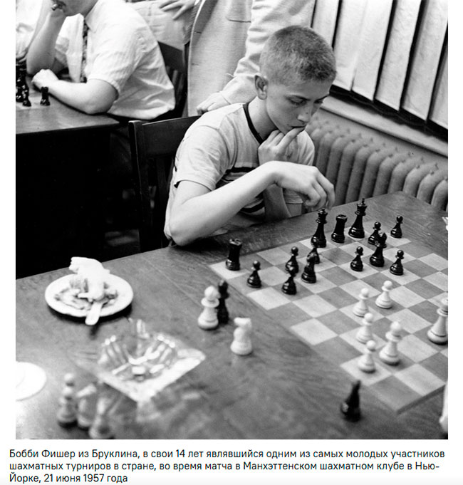 С 1956 года, когда ему было всего 13 лет, после победы на юниорском чемпионате США о Бобби Фишере узнал весь шахматный мир. Он просчитывал на семь ходов вперед, в то время как соперники только на три. Через год – в 14 лет! – Фишер стал чемпионом США среди взрослых. В 1959 году в возрасте 15 лет он стал международным гроссмейстером — самым молодым на то время, заняв пятое место на турнире в Югославии.Фишер никогда не выпадал из зоны внимания американской политической и деловой элиты. Его неформальным куратором был полковник Эд Эдмондсон, имевший связи в правительстве. Фишера финансировали американские миллионеры, выделившие 200 тысяч долларов (сегодня это сумма эквивалентна примерно двум миллионам долларов) на подготовку матча с Борисом Спасским. Постоянно опекал его и меценат Фред Крамер.