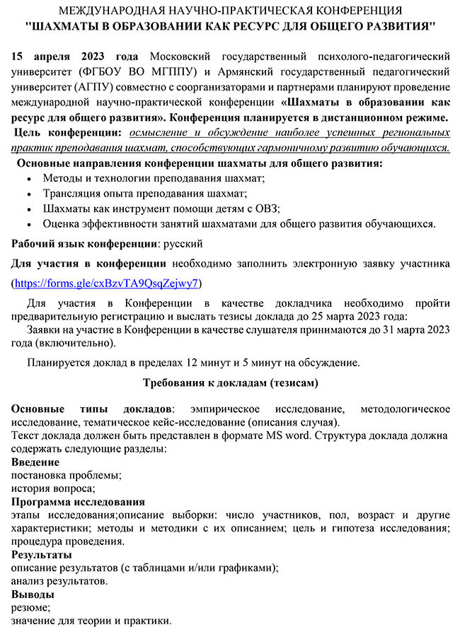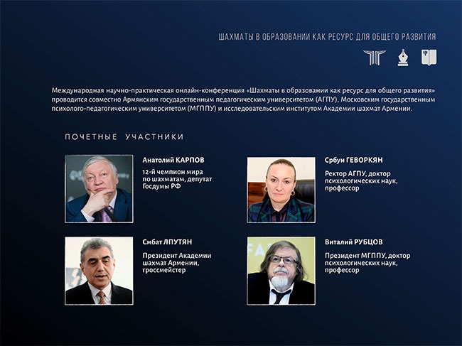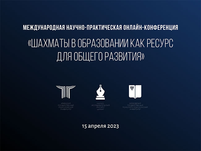 15 апреля Московский государственный психолого-педагогический университет (ФГБОУ ВО МГППУ) и Армянский государственный педагогический университет (АГПУ) совместно с соорганизаторами и партнерами проведут международную научно-практическую онлайн-конференцию "Шахматы и образование как ресурс для общего развития".