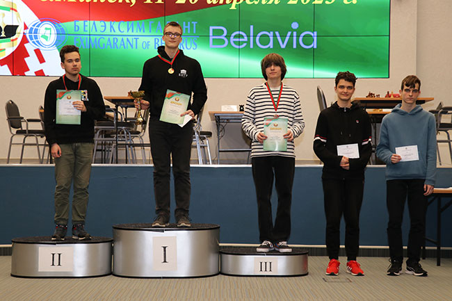У юношей также не обошлось без дележа за золото. Благодаря победе в личной встрече первое место завоевал Максим Царук (7 очков), серебряная медаль у Артема Стрибука (7 очков). Бронза - у Михея Науменко (5,5 очков). Кроме призеров соревнований денежные сертификаты от ОО "Белорусская федерация шахмат" получили Артем Синявский (4 место, 5 очков) и Алексей Григорович (5 место, 4,5 очка).
