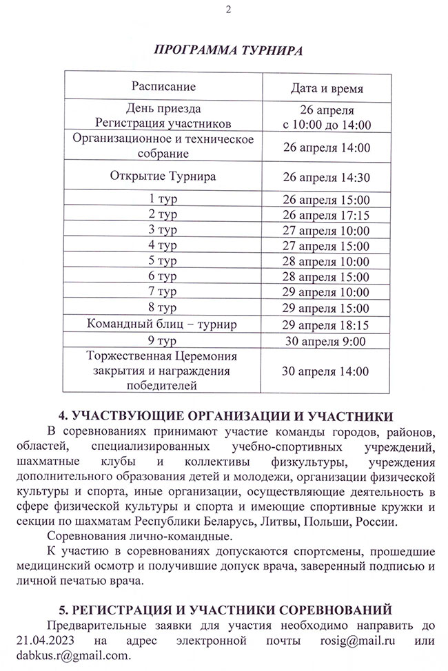 К участию в соревнованиях приглашаются шахматисты Республики Беларусь, а также стран ближнего и дальнего зарубежья, уплатившие стартовый взнос и прошедшие предварительную регистрацию. Предварительные заявки для участия необходимо направить до 21.04.2023 на адрес электронной почты rosig@mail.ru или dabkus.r@gmail.com.