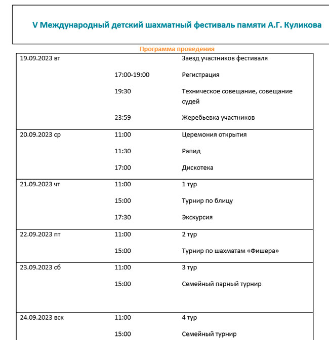 Мероприятия Фестиваля проводятся по следующему расписанию: