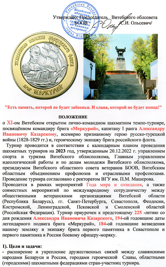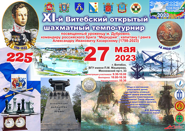 В прошедшую субботу в помещении библиотеки ВГУ им. П.М. Машерова состоялся XI Витебский шахматный турнир памяти А.И. Казарского. Он был организован Витебским областным советом ветеранов БООВ, управлением спорта и туризма облисполкома и профсоюзом работников государственных и других учреждений. Турнир состоялся в день знаменитого сражения российского брига «Меркурий» (14.05.1829 г.) и был также посвящен предстоящему 225-летию со дня рождения Героя, чей неповторимый подвиг признан во всем мире. Точная дата и год рождения нашего земляка были установлены автором статьи в результате исследования документов российских государственных архивов, а также материалов профессиональных исследователей и биографов.
