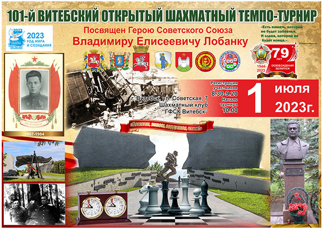 В минувшую субботу 1 июля 2023 года в рамках мероприятий, посвященных Дню Независимости Республики Беларусь и 79-й годовщине освобождения Белоруссии от немецко-фашистских захватчиков, в помещении шахматного клуба ГФСК «Витебск» прошел Витебский открытый шахматный турнир, памяти Героя Советского Союза Владимира Елисеевича Лобанка.