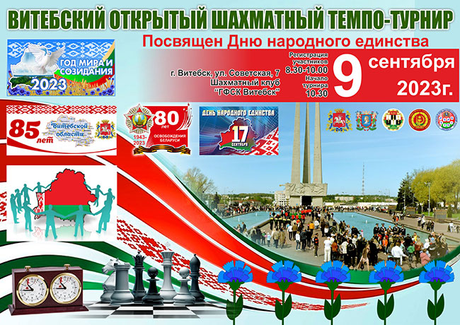 Витебский открытый лично-командный шахматный темпо-турнир проводится в рамках областных мероприятий Года мира и созидания, плана по взаимодействию в вопросах международного сотрудничества между общественными ветеранскими организациями Витебской области (Республика Беларусь) и регионов Российской Федерации и приурочен к 17 сентября, Дню народного единства. Календарный план проведения шахматных соревнований на 2023 год утвержден 20.12.2022 г. управлением спорта и туризма, Главным управлением идеологической работы и по делам молодежи Витебского облисполкома, президиумом Витебского областного совета ветеранов БООВ, Витебским областным объединением профсоюзов.