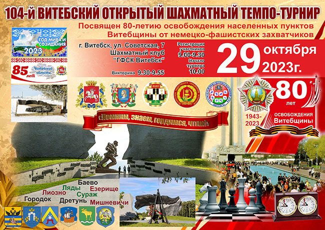 29 октября в Витебске завершился очередной 104-й Витебский открытый лично-командный шахматный темпо-турнир, который собрал 64 участника из трех стран, 9 регионов нашей страны и был приурочен к 80-летию долгожданного начала освобождения от немецко-фашистских оккупантов населенных пунктов северо-восточной части Витебской области. Как известно, в октябре – декабре 1943 года были освобождены первые города, крупные местечки и деревни Витебской области. Так уже в первые числа октября было освобождены: Баево, Ляды, Россасно Дубровенского района, первый райцентр области Лиозно, а в дальнейшем Езерище, Сураж, Городок и другие. Турнир был призван напомнить жителям области об этих событиях, важности сохранения памяти о них и подвигах воинов-освободителей, а организован Витебским областным советом ветеранов совместно с ДЮСШОР № 8 и проведен на базе шахматного клуба ГФСК «Витебск.