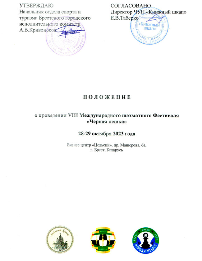 Данное положение является официальным приглашением принять участие в 8-ом Международном шахматном Фестивале «Черная пешка» (далее Фестиваль), который пройдет с 28 по 29 октября 2023 года. Место проведения – бизнес центр «Цельсий», пр. Машерова, 6а, город Брест, Беларусь, сайт — http://cels.by/