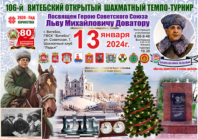 В прошедшую субботу 13 января 2024 года в шахматном клубе ГФСК «Витебск» состоялся 106–й Витебский открытый шахматный лично-командный темпо-турнир, который в третий раз был посвящен нашему легендарному земляку, уроженцу Бешенковичского района Герою Советского Союза Льву Михайловичу Доватору.