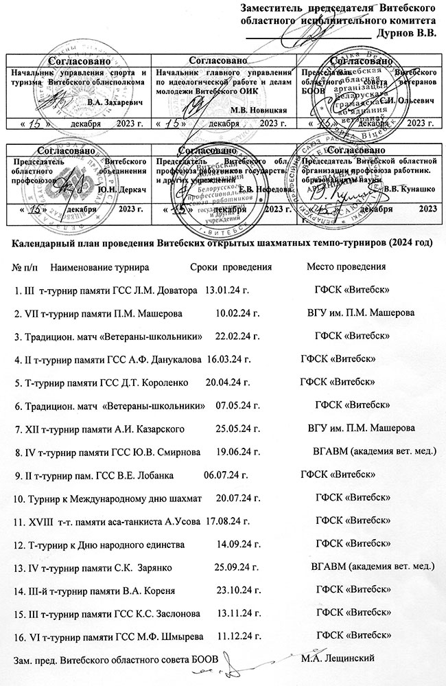 Витебский открытый лично-командный шахматный темпо-турнир проводится в рамках областных мероприятий, посвященных 80-летию освобождения Белоруссии от немецко-фашистских оккупантов, плана по взаимодействию в вопросах международного сотрудничества между общественными ветеранскими организациями Витебской области (Республика Беларусь) и регионов Российской Федерации и посвящен Герою Советского Союза Льву Михайловичу Доватору. Календарный план проведения шахматных соревнований на 2024 год утвержден 15.12.2023 г. управлением спорта и туризма, Главным управлением идеологической работы и по делам молодежи Витебского облисполкома, президиумом Витебского областного совета ветеранов БООВ, Витебским областным объединением профсоюзов и отраслевыми профсоюзами.