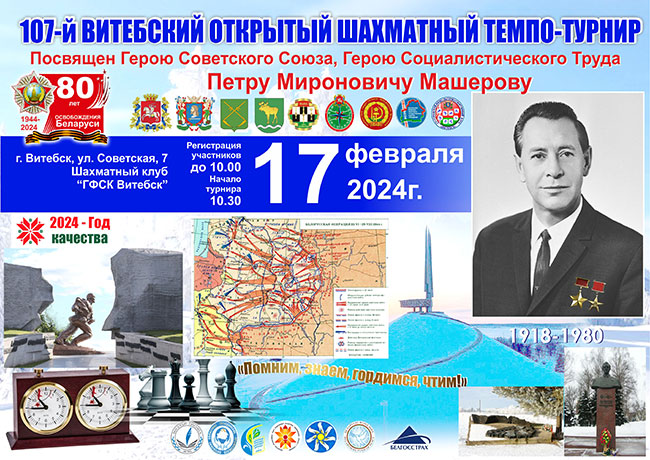 17 февраля в шахматном клубе ГФСК «Витебск» состоялся 107 Витебский открытый шахматный лично-командный темпо-турнир, посвященный земляку, Герою Советского Союза, Герою Социалистического Труда, государственному и политическому деятелю страны Петру Мироновичу Машерову.