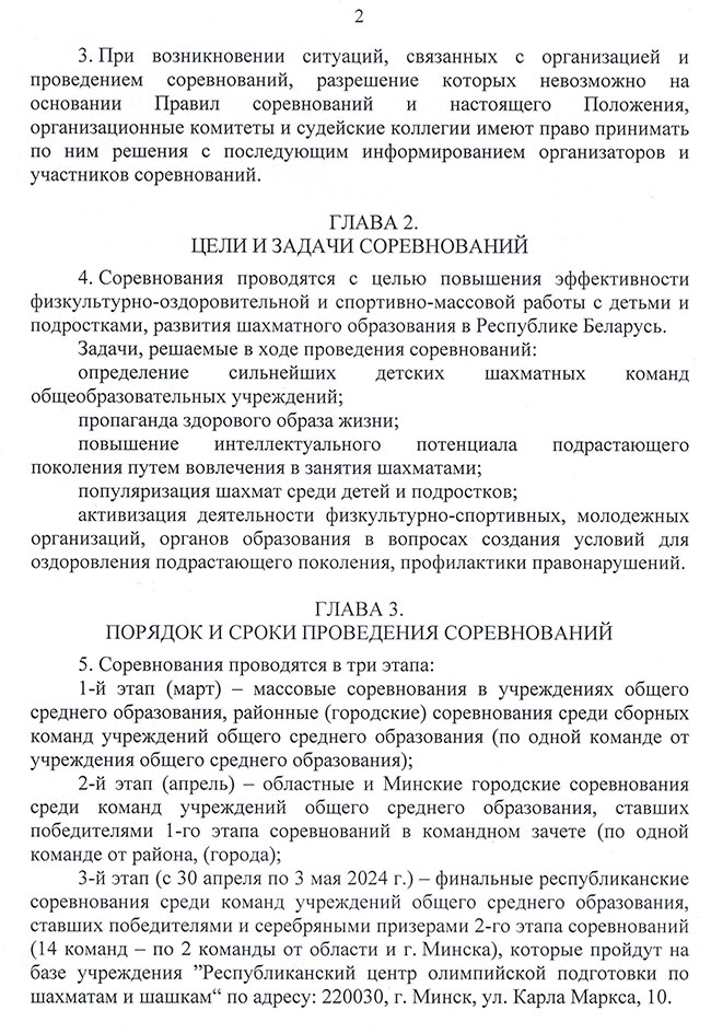 Соревнования проводятся с 30 апреля по 3 мая 2024 г. на базе учреждения «Республиканский центр олимпийской подготовки по шахматам и шашкам» (г.Минск, ул. К.Маркса, 10), по швейцарской системе в 7 туров при участии 14 команд.