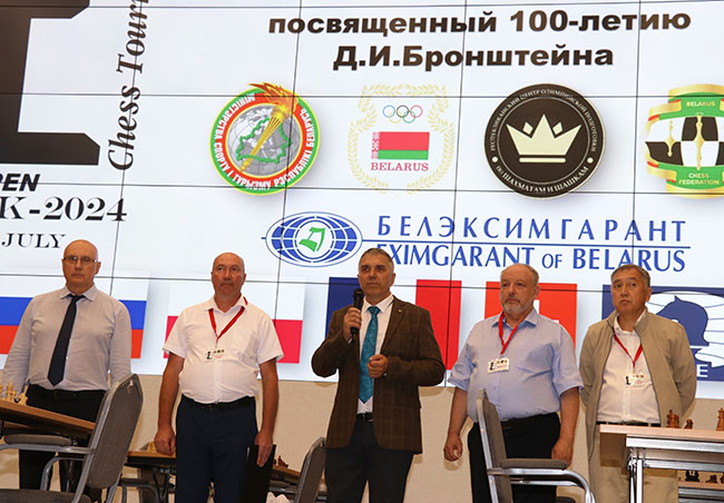 На торжественной церемонии открытия присутствовали председатель ОО "БФШ" Сергей Сычук, директор РЦОП по шахматам и шашкам Сергей Корчинский, главный судья соревнований Игорь Стрелец, директор турнира Владимир Гинзбург и председатель аппеляционного комитета "Минск-2024" Болат Асанов.