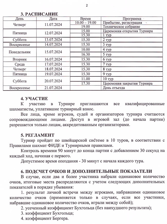 Турнир проводится по швейцарской системе в 10 туров в г.Минске на спортивной базе Республиканского центра олимпийской подготовки по шахматам и шашкам (ул.К. Маркса, 10) с 11 июля (день приезда) по 21 июля (день отъезда) 2024 года.