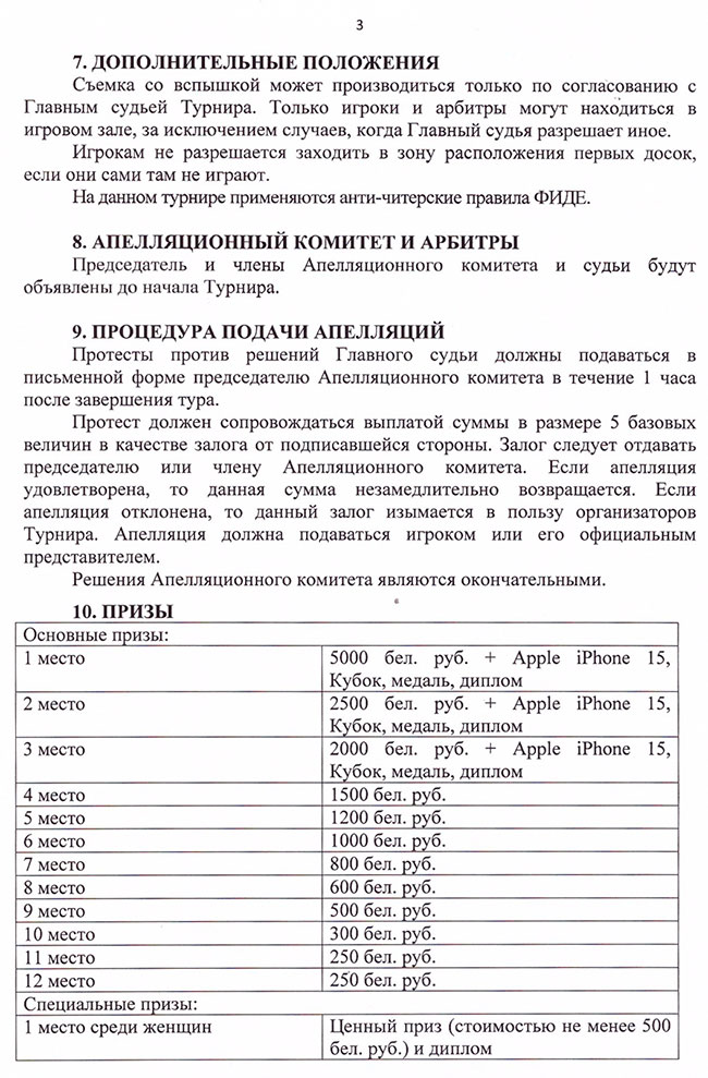 Протесты против решений Главного судьи должны подаваться в письменной форме председателю Апелляционного комитета в течение 1 часа после завершения тура. Протест должен сопровождаться выплатой суммы в размере 5 базовых величин в качестве залога от подписавшейся стороны. Залог следует отдавать председателю или члену Апелляционного комитета. Если апелляция удовлетворена, то данная сумма незамедлительно возвращается. Если апелляция отклонена, то данный залог изымается в пользу организаторов Турнира. Апелляция должна подаваться игроком или его официальным представителем. Несвоевременно поданный протест не рассматривается. Решения Апелляционного комитета являются окончательными.