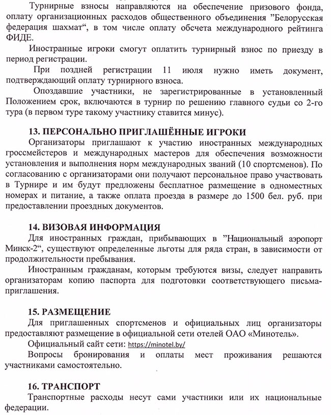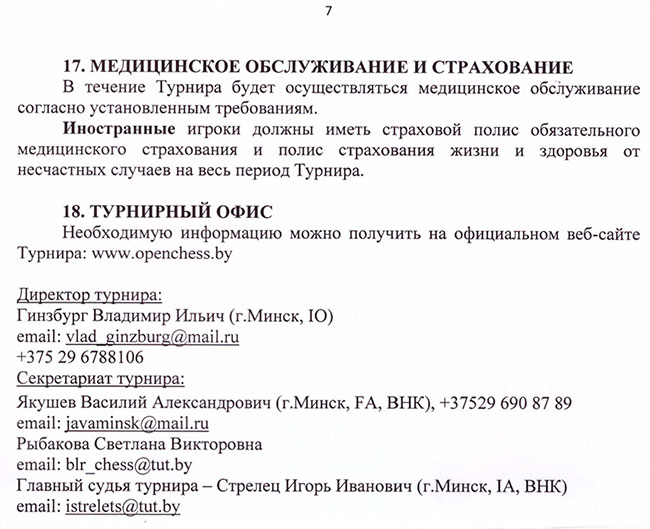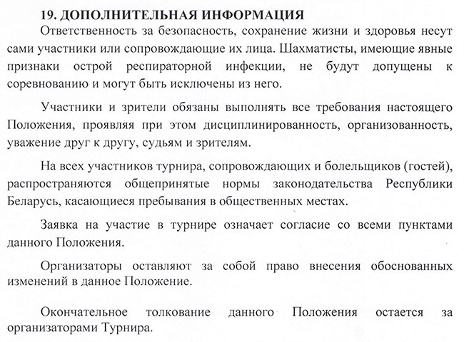 С учетом эпидемиологической обстановки в г. Минске шахматисты, имеющие явные признаки острой респираторной инфекции, не будут допущены к соревнованию и могут быть исключены из него.
