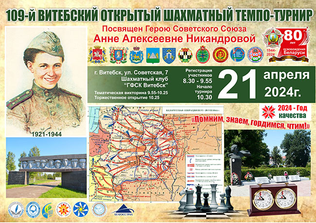 В прошедшее воскресение в г. Витебске состоялся очередной открытый шахматный темпо-турнир, в этот раз посвященный Герою Советского Союза старшему лейтенанту Анне Алексеевне Никандровой. Он был организован Витебским областным советом ветеранов, ГФСК «Витебск» и Витебской областной организацией Белорусского профсоюза работников государственных и других учреждений в соответствии с планом мероприятий по предстоящему празднованию 80-летия освобождения Белоруссии от немецко-фашистских оккупантов. Россиянка, уроженка Псковской земли Анна Никандрова совершила свой подвиг 23 июня 1944 года в первый день операции «Багратион», подняв в атаку бойцов и, блокировав сильно укрепленный пункт врага. Она погибла у д. Киреево Дубровенского района Витебской области, перезахоронена в Дубровно, где ее имя носит улица и СШ № 1, как и на ее родине. Перед началом турнира состоялись традиционная выставка, лекторий и тематическая викторина среди участников, посвященная героической жизни Анны Никандровой, а также 80-летию освобождения. Победителями ее стали: Дмитрий Зуев (СШ № 44 г. Витебск), Михаил Поволоцкий (СШ № 40 г. Витебск), Тимофей Антоневич (СШ № 3 г. Толочин).