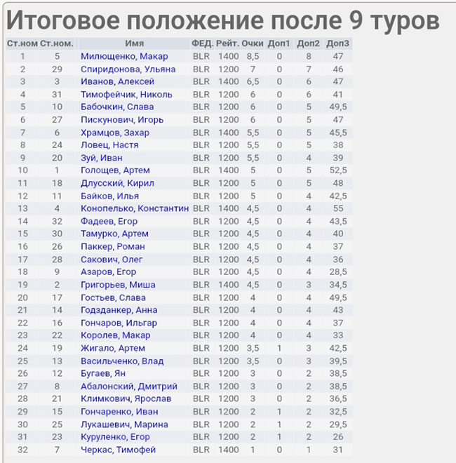 Победителем турнира стал Милющенко Макар, набрав 8,5 очков из 9, (СДЮШОР 8), второе место у Спиридоновой Ульяны 7 из 9 ( ЦИП "Одари"), третье место занял Иванов Алексей, 6,5 из 9 (СДЮШОР 8). Лучшие воспитанники Дворца детей и молодежи Тимофейчик Николь, Бабочкин Слава и Пискунович Игорь расположились на 4-6 местах в шаге от пьедестала, но также выполнили норму третьего разряда!