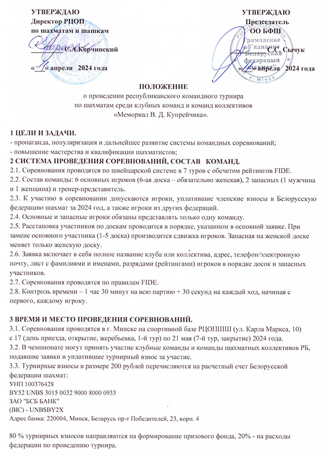 3.4. Заявки на участие с копией оплаты турнирного взноса направляются на электронную почту Белорусской федерации шахмат blr_chess@tut.by до 15 мая 2024 года.
