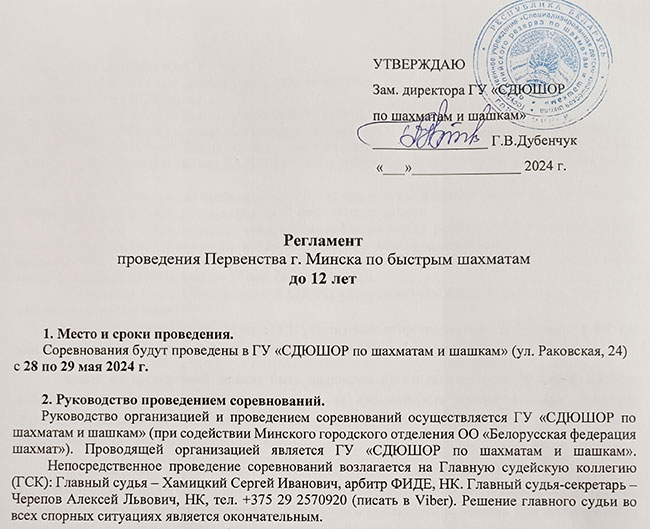 Допустимое время опоздания – 10 минут. Участник, пропустивший тур и не предупредивший до его окончания Главного судью, исключается из соревнования. Участники турнира должны являться членами ОО «БФШ», иметь оплаченный членский взнос за 2024 г., регистрацию в г. Минске или Минском районе.