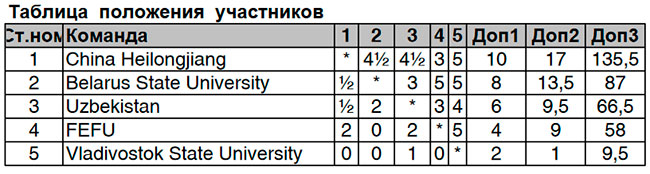 По итогам соревнований у белорусских шахматистов 3 победы (5:0 над ДФУ, 3:2 над Узбекистаном, 5:0 над ВГУ), проигрыш китайцам 0,5:4,5 и общее 2 место. Поздравляем!