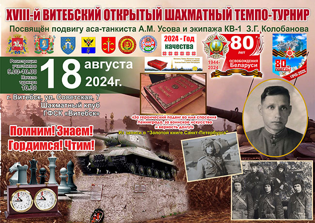 18 августа в рамках мероприятий, посвященных 80-й годовщине освобождения Белоруссии от немецко-фашистских захватчиков, в помещении шахматного клуба ГФСК «Витебск» состоялся очередной Витебский открытый шахматный турнир. Его организаторами выступили Витебский областной совет ветеранов, ГФСК «Витебск» и музей им. Героя Советского Союза М.Ф. Шмырева. Турнир был приурочен к приближающейся дате подвига нашего земляка из д. Барсуки Дубровенского района, наводчика орудия танка КВ-1 Андрея Усова и всего экипажа Зиновия Колобанова, подбившего 22 немецких танка 20 августа далекого 1941 года в одном бою под Красногвардейском (Гатчиной).