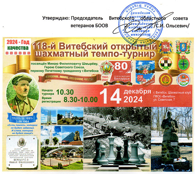 14 декабря состоялся 118 Витебский открытый лично-командный шахматный темпо-турнир, в этот раз, посвященный Минаю Филлиповичу Шмырёву, Герою Советского Союза, первому Почетному гражданину г. Витебска. Организаторами турнира выступили: Витебский областной совет ветеранов и ГФСК «Витебск.