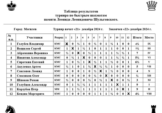 В Могилеве, в помещении шахматной школы «Ферзь» 21 – 22 декабря прошел турнир по быстрым шахматам, посвященный памяти Леонида Леонидовича Шульговского.