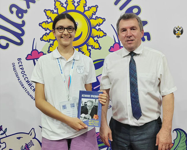 Надо отметить, что Дария последней закончила партию с именитым гроссмейстером. В какой-то момент у нее на доске даже было небольшое преимущество, однако в эндшпиле опыт сказался. Но фото на память с гроссмейстером и подаренная книга Александра Калинина "Истинное призвание" (рассказывает о жизни и шахматном творчестве заслуженного тренера СССР Абрама Хасина) подсластили пилюлю поражения.